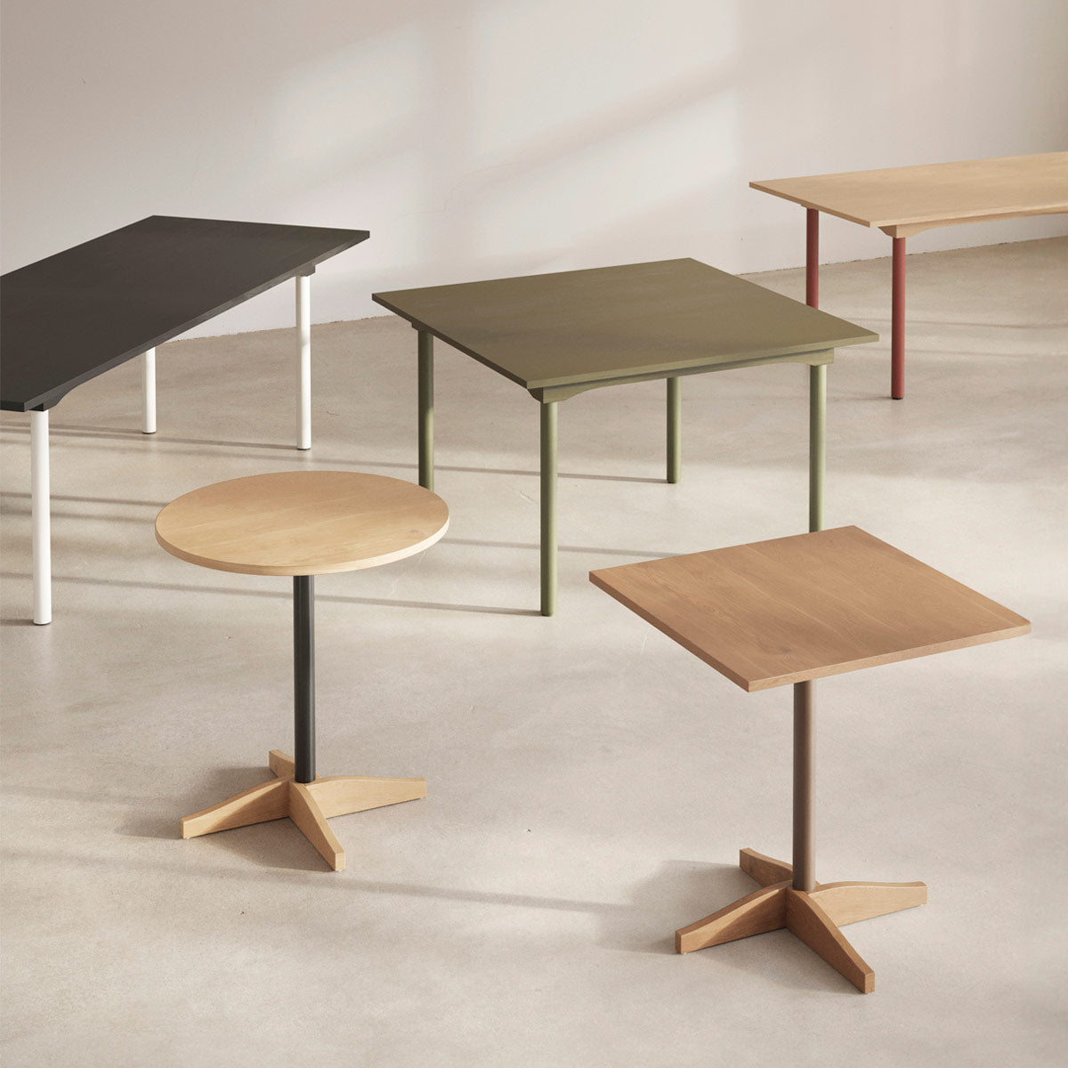 Jouant sur le contraste des matériaux, -le métal et le chêne massif- et le jeu des couleurs, cette collection, aux lignes élégantes et épurées se décline autour d’une assise et d’un système de tables.